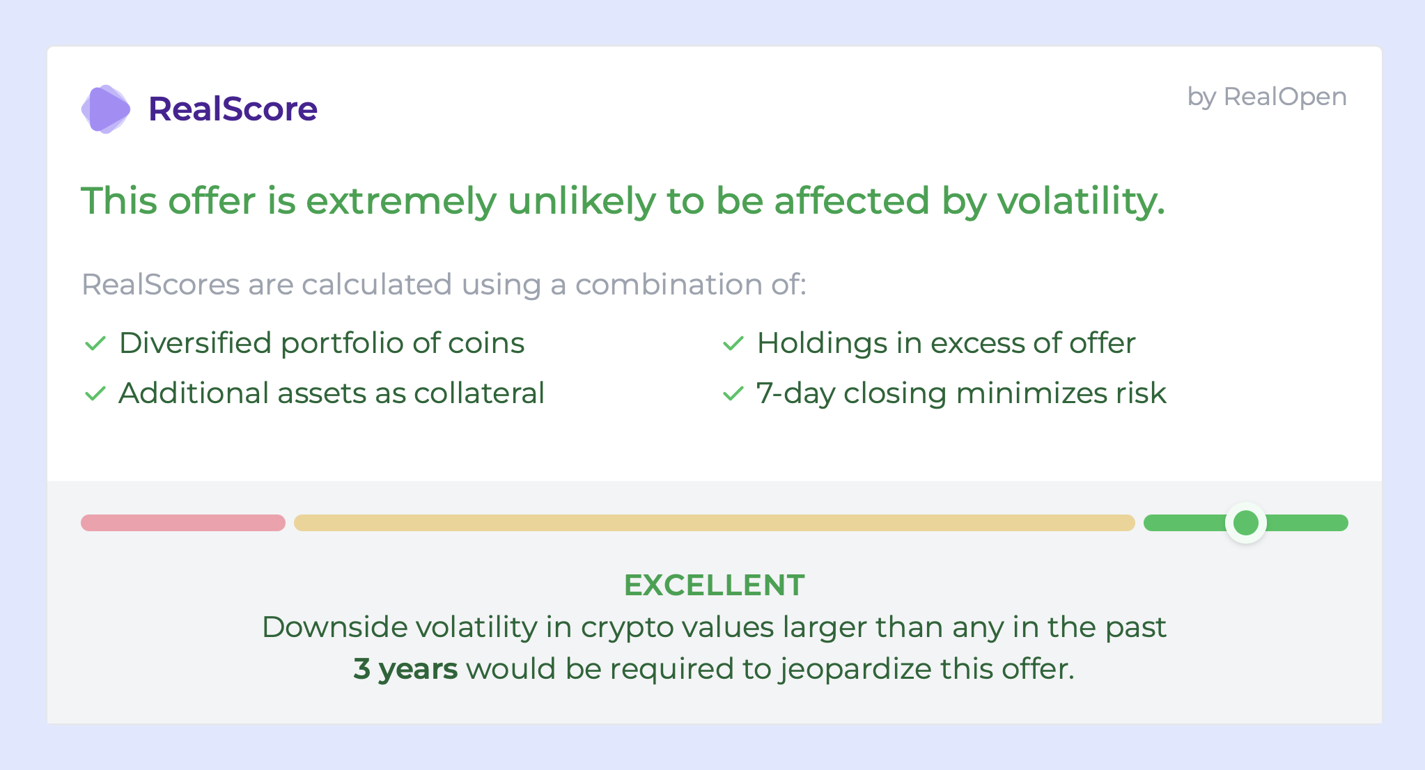RealScore is analogous to a traditional credit score, in that it deems a crypto buyer as viable to a home seller, much like a credit score does for consumers to lenders. Not only does RealScore accurately measure the buyer’s purchasing power, the platform also offers predictive indicators to the seller to assess the strength of a real estate offer. And, like traditional credit scores, it offers digestible at-a-glance data with a simple color-coded scale.